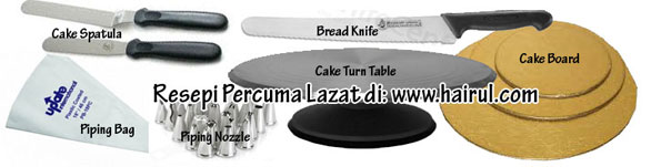 Ini merupakan peralatan untuk dekorasi kek. Ia boleh di beli di kedai bahan-bahan bakery. Untuk Cake turn table tu, elok beli yang besi dan mudah dipusing. Pisau Kek atau pisau roti digunakan untuk memotong kek, Spatula pula untuk meratakan cream. Cake board pula untuk meletakkan kek. Dan Cake Turn Table untuk menghias kek. Turn table elok beli yang besi kerana mudah dipusingkan. Manakala piping bag untuk menghias kek dengan cream.