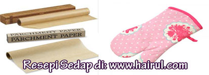 Kita perlukan kertas minyak atau baking perchment paper untuk dijadikan alas pada loyang kek. Ia boleh di beli dengan mudah di hypermarket atau di kedai runcit. Manakala glove digunakan untuk memegang loyang panas dan mengeluarkan dari oven. Boleh gantikan dengan kain biasa di rumah anda. .